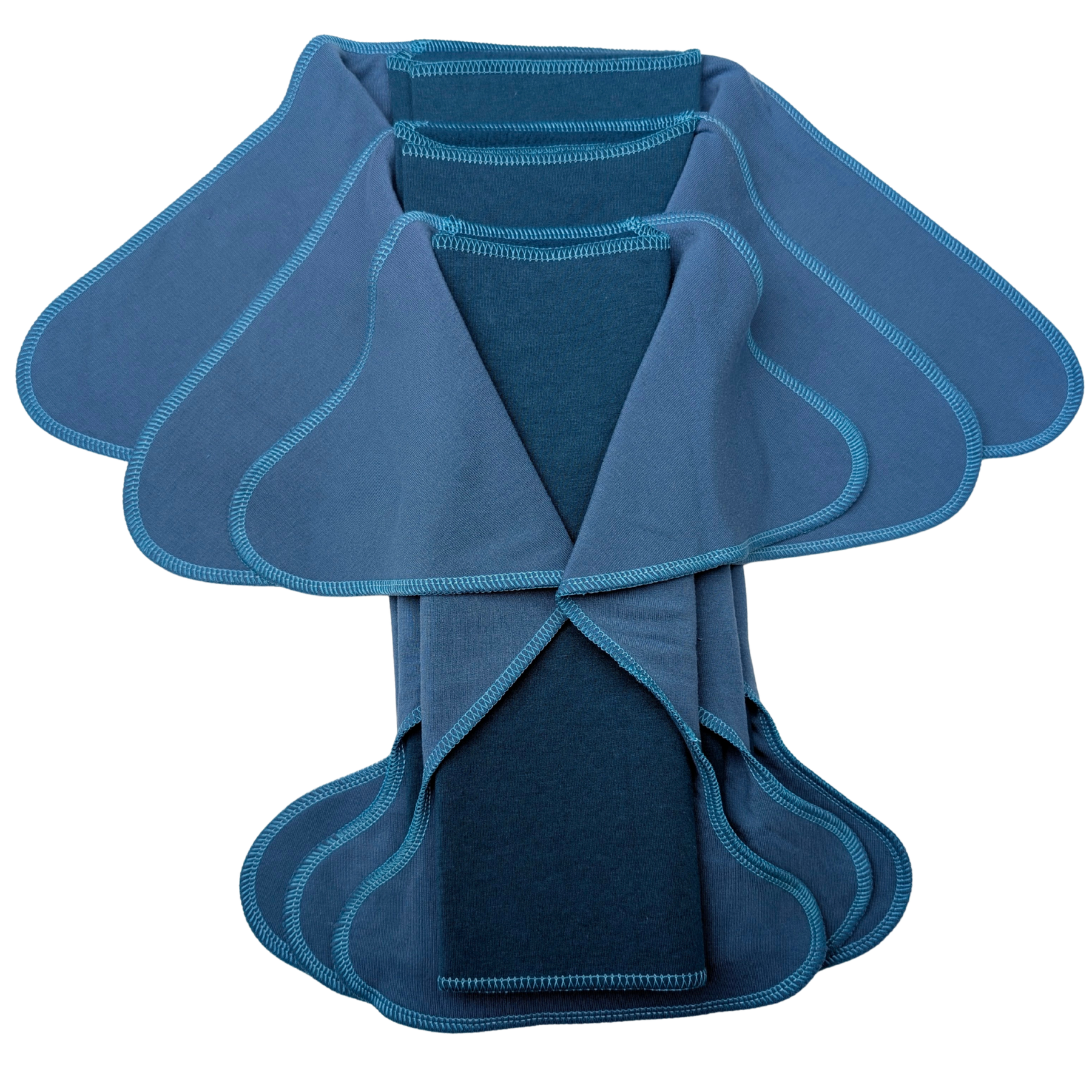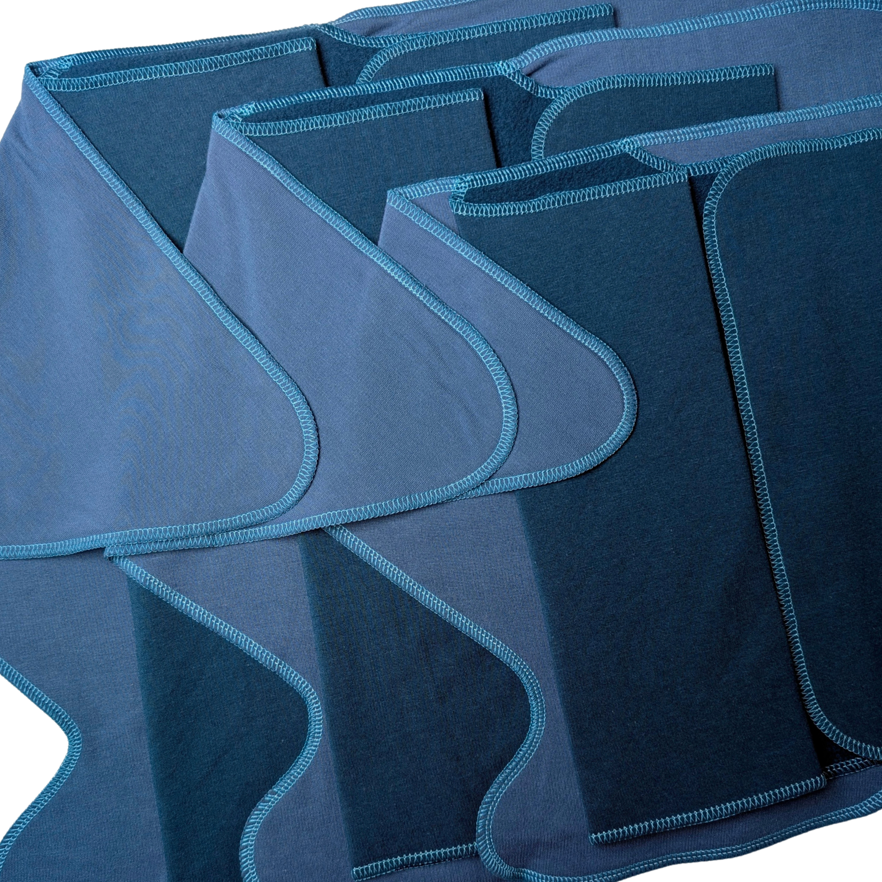 Our Fixed Flats come in prints, solids, naturals, and hand-dyed options so there is something for everyone to love!  The hand-dyed options are ice dyed with fiber reactive dye, creating a permanent molecular bond to the fabric.  These colors are vibrant and will not fade!  Please note that hand-dyed items may have excess dye remaining in them and will need soaked and washed separately before wearing and washing with a mixed load.  Also, with the technique used, there are no two alike, making each a unique work of art!  We also offer a large variety of fabric blends including those that have organic cotton, merino wool, hemp, lyocell, and bamboo viscose.  Please see the care card that comes with your order with instructions on wash and how to prepare each type of fabric for absorbent use.  You can also find detailed washing/care instructions on our website HERE.